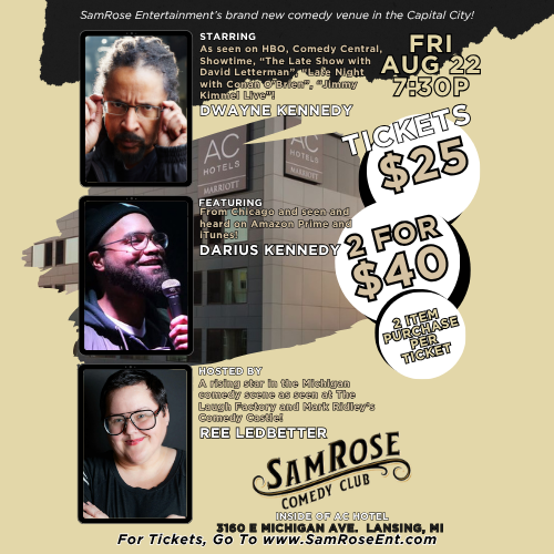 SamRose Entertainment is thrilled to present the incredible Dwayne Kennedy in Lansing, featuring the talented Darius Kennedy and hosted by Michigan favorite, Ree Ledbetter! ABOUT DWAYNE: Dwayne Kennedy is a renowned stand-up comedian, actor, and writer, celebrated for...